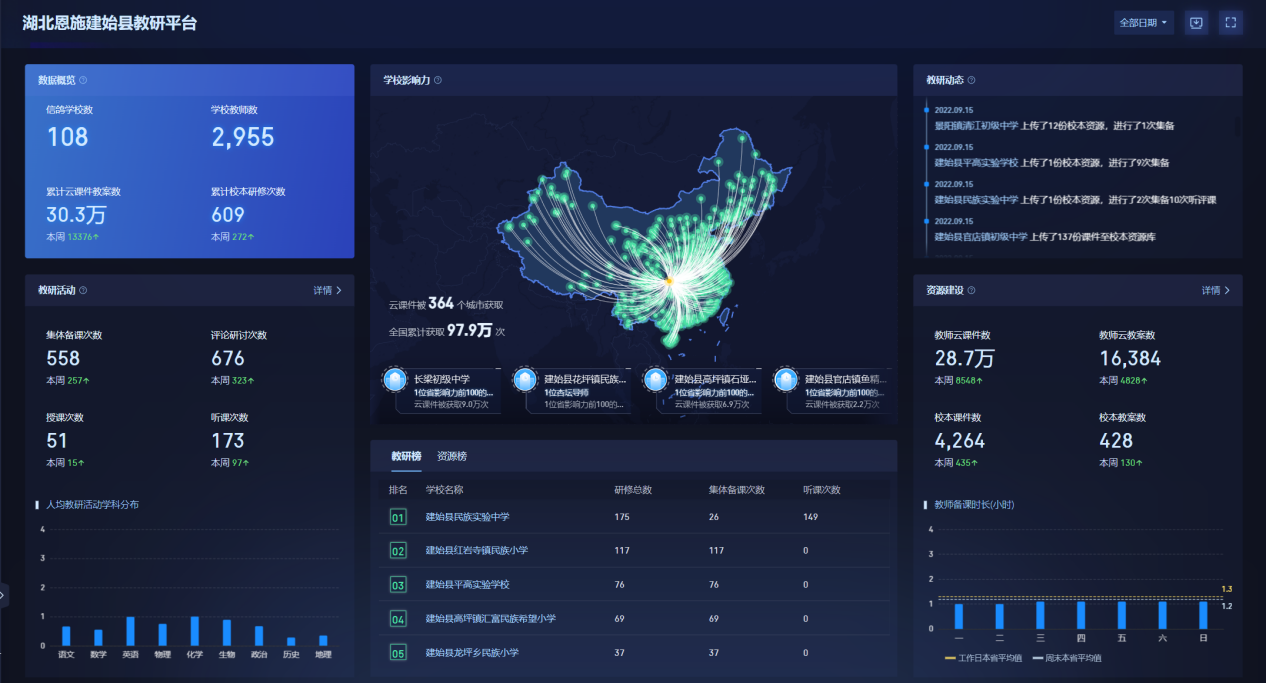 本次培訓(xùn)成果斐然,在全縣教研管理平臺(tái)上可以清晰地了解到,短短一周時(shí)間云課件教案數(shù)增長了13376份,校本研修次數(shù)增長了272次,累計(jì)云課件教案數(shù)總量更是達(dá)到了驚人的30.3萬份,統(tǒng)計(jì)顯示全縣區(qū)域老師們主動(dòng)分享到希沃白板課件庫的課件,被全國364個(gè)城市的老師累計(jì)獲取了97.9萬次,讓數(shù)萬全國教師享受到了建始教育資源。